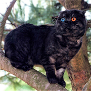 Wysoki, pulchny, szeroki w barach kocur o czarnym krótkim dymnym (ghost markingi) tygrysio pręgowanym futrze. Ma białą końcówkę ogona i podeszpy tylnych łap. Lewe oko - pomarańczowe, prawe - niebieskie. Oklapnięte uszy typu fold. |