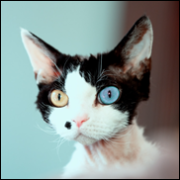 atletyczna, mocno umięśniona, nieduża kotka o karbowanej, biało-czarnej sierści (większość biała, ma tylko czarne plamy na tylnych nogach, głowie, łopatce i jedną na zadzie oraz czarny ogon), ma płaską głowę i dwukolorowe oczy: jasnoniebieskie i żółte |