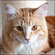 dość drobny, długowłosy, rudy złoty kot z bielą na pyszczku, szyi, palcach łap oraz nad nosem. bursztynowe oczy. |