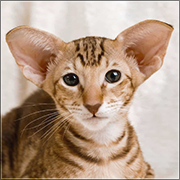 miks orientalnego krótkowłosego; cynamonowy pręgowany klasycznie, biała końcówka ogona, zielono-żółte oczy. Niski. |